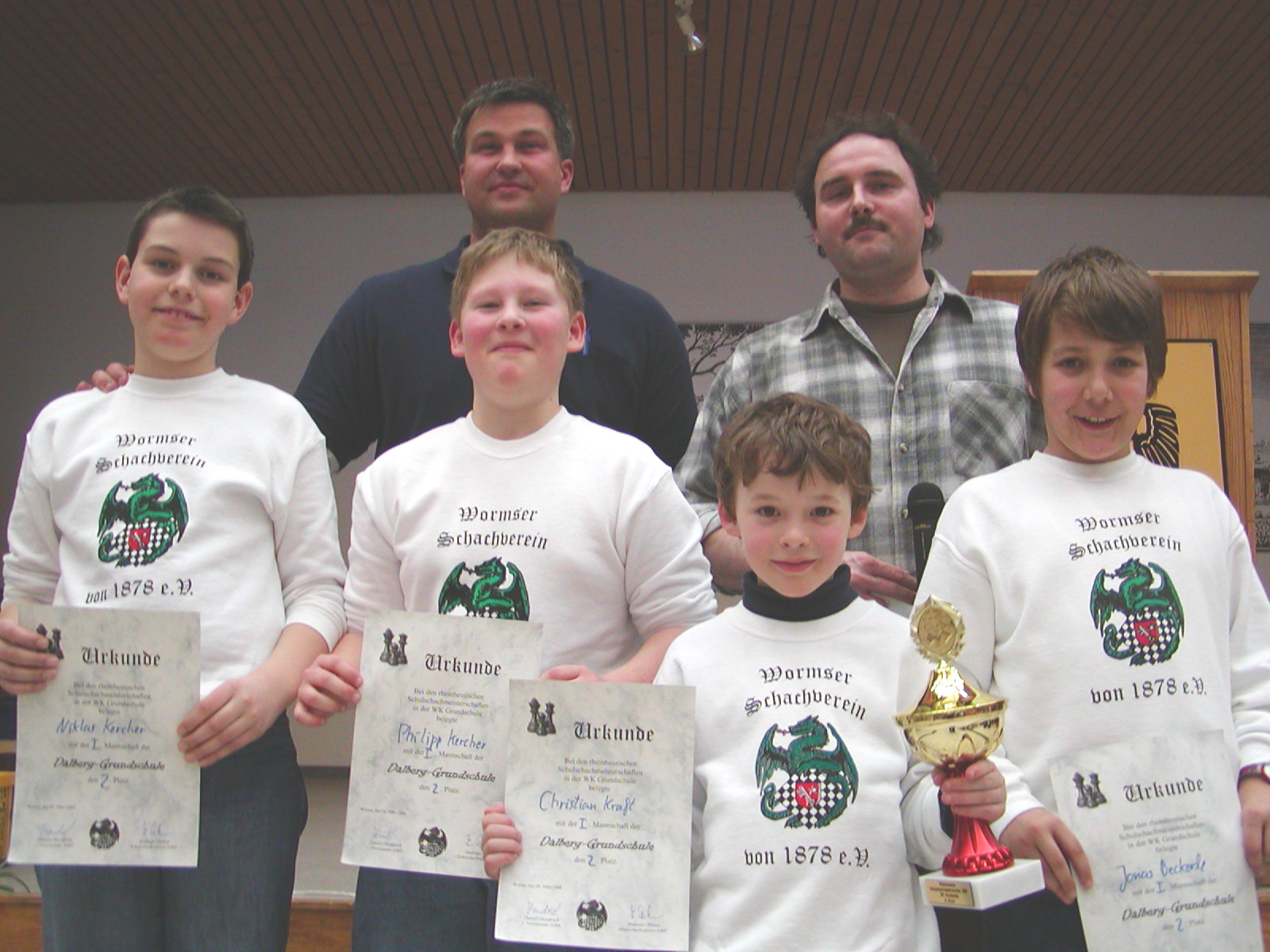 Der vorjährige Rheinland-Pfalz-Meister, die Dalbergschule aus Herrnsheim, wurde mit 12 – 2 Punkten Zweiter. Nicht ganz so gut wie erwartet schnitt die erste Mannschaft der Westend-Grundschule mit dem Grundschulstadtmeister Christoph Martin am ersten Brett ab. Sie wurden mit 10 – 4 Punkten Dritter. Platz vier errang die erste Mannschaft der Ernst-Ludwig-Schule. An dieser Brennpunktschule mit einem Immigrantenanteil von ca. 50% betreut der städtische Erzieher Marcus Kloster im Rahmen der Spiel- und Lernstube gleich mehrere Schach-AGs und kooperiert sehr erfolgreich mit dem Wormser Schachverein.